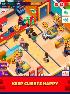 Unlock new spots and equipment in the different departments available and increase the number of clients that you can attend (fryers, shelves, reception counters, etc.). Invest your money and resources and adapt your strategy accordingly to get the best result.