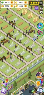 You are the boss of a cemetery and you can gradually upgrade a poorly managed graveyard into a super-luxury one.