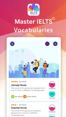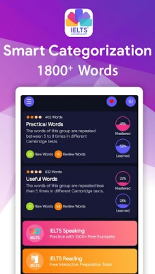 The learning technique, applied in the application, allows you to quickly learn new English words, which are often used in the IELTS tests. It will give huge support for all of IELTS Listening exercises, IELTS Reading practice, IELTS Writing and IELTS Speaking modules.