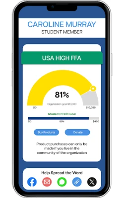 - Supporter Convenience: Friends and family can purchase or donate through a secure e-commerce page—accessible via links or QR codes—using credit or debit cards. A progress graphic shows individual and organization profit goals in real time.
