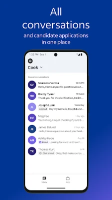 Connect with candidates over a call or chat. Each inbox is job-specific, to help keep focus on candidate context.