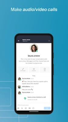 - Send messages and files or make audio/video calls with one person, a group of people or an entire public or private channel.