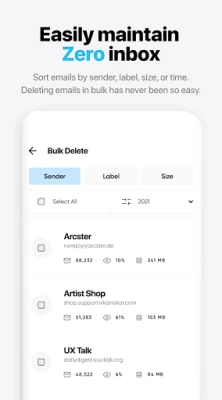 + Instaclean also aggregates all the emails by sender, label and size that can be deleted in bulk.