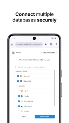 Quick: it only takes seconds to write and tag a note Secure: use the official Notion authorisation method, without generating your tokens manually. Your data is transmitted directly to Notion. Offline: notes saved without internet connection will be sent later.