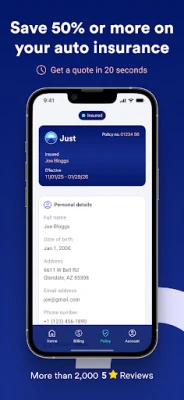 Just’s Pay per mile car insurance saves you money by charging you for the miles you drive, instead of a set monthly rate. We make insurance policies affordable and flexible - so they work better for you. With flexible contracts and no hidden fees, choose a fair full coverage or minimum liability auto insurance policy, and get the protection you need for less than Geico, Allstate, Progressive, and other large insurance providers. Record your miles with the app, and get rewarded for being a great driver. We think that’s just a fairer way to do business. Our support team and agents are on-call and ready to help pick the best policy for you. Get started today and see how much you could save with Just's top rated car insurance.