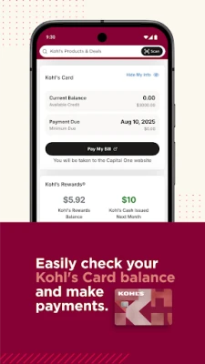The Kohl’s App keeps you signed in so you can easily check your Kohl's Card balance and make payments. Plus, it tracks your rewards balance and progress toward your next $5 reward.