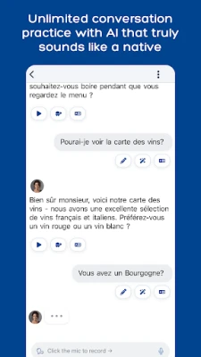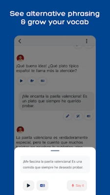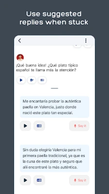 - Choose a conversation. You’ll find a huge choice of conversations designed for learning (e.g. roleplays, debates, vocab & grammar practice). Or you can simply chat about your interests.