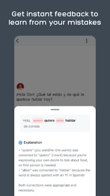 - Express yourself freely and learn from your mistakes. Get corrected in one click, or review detailed feedback at the end of a chat.