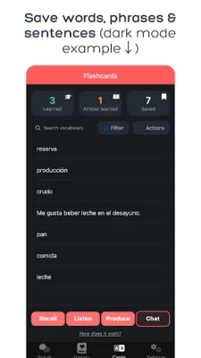 - Practice your saved words via conversations where the AI will incorporate them and get you using them in context.