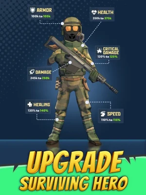 In this zombie shooting game, you can transform your last survivor into an invincible monster killer with a wide range of upgrades. The hero's upgrades directly affect how fast he can run and how accurately he can gun down zombies. Don't forget to upgrade the hero’s equipment and auto-guns, which are crucial in our apocalyptic 3D shooter game. A huge arsenal of auto-guns for every taste and power will be available to you. Upgrading and combining roguelike skills will grant the last survivor unlimited power, enabling him to mow down waves of zombies by the hundreds.