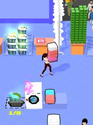 Indeed, don’t forget to improve your hero skills! Go to the manager desk to increase your speed and upgrade your hero to do the laundry faster. Also, upgrade the speed of the washing machines. Wash more clothes to earn more. Money will help to grow faster and build your own laundry empire.