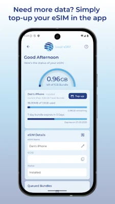 - Top up or add additional eSIMs easily inside the app