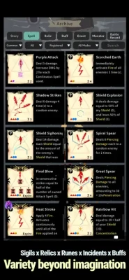 - Collect appropriate Spells and Relics to complete your own deck and defeat increasingly powerful monsters.
