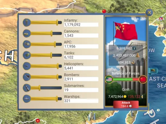 • Build an invincible army: tanks, fighters, helicopters, warships, submarines; study and build nuclear weapons and warheads.