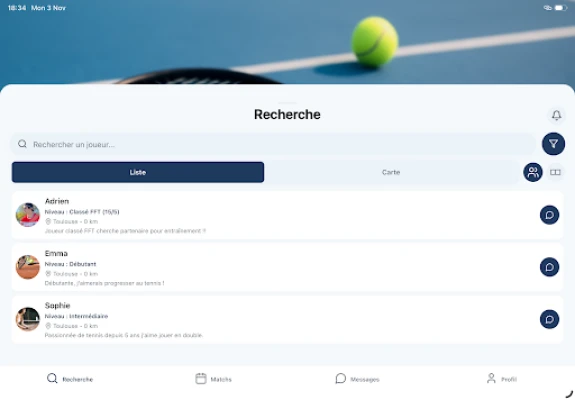 Vous cherchez quelqu'un avec qui jouer au tennis ? MatchUp vous connecte avec des joueurs de votre niveau, près de chez vous !