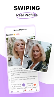 SeniorMeetMe is a dating application designed specifically for individuals aged 50 and above. It aims to connect senior people seeking companionship, friendship, or romantic relationships with like-minded individuals in their local area. With a focus on providing a safe and user-friendly platform, SeniorMeetMe offers a range of features to enhance the dating experience for seniors in the golden years of life.