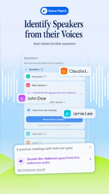 The app recognizes who's speaking and labels them automatically. Tag someone once, and Meeting.ai remembers them forever. Search by speaker name to find what specific people said in any meeting. No more wondering who said what or when important decisions were made.