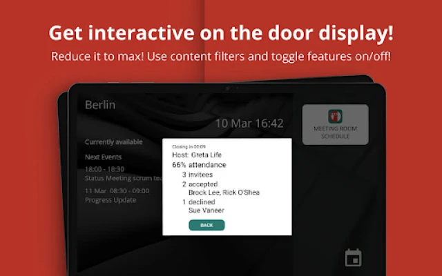 Meeting Room Schedule enables anyone in a company or organization to see the schedule of a conference room instantly. It’s perfect for organizations where meeting rooms are overbooked and collisions are a part of everyday business life.