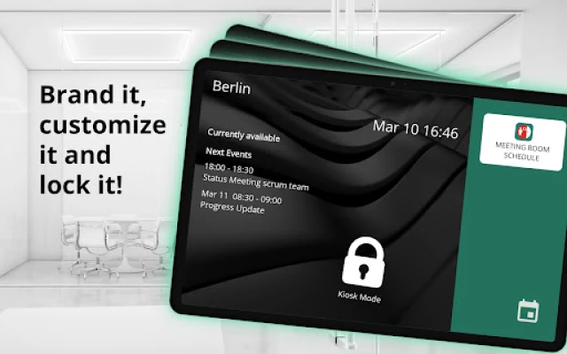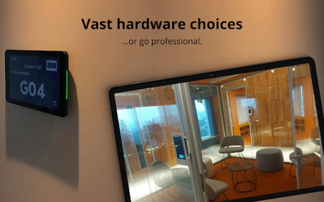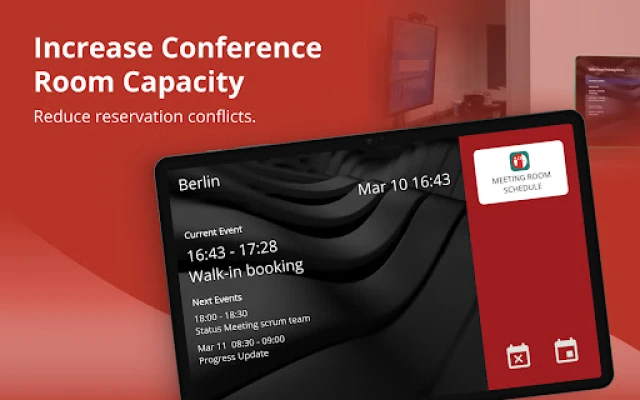 Use it for meeting rooms or for displaying any business resource calendar. Consider using it for shared resources like equipment, team calendars, customer appointments or announcements of major events like corporate town hall meetings.