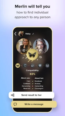 Merlin has already analyzed tens of thousands of faces of different people and now knows everything about the character, habits and behavior of any person. All you have to do is upload a photo or screenshot of the person you're interested in, and you'll learn useful information about him or her. Feel much more confident in correspondence and on a date - with Merlin you'll know exactly what to write and how to answer, what's worth saying and what topics to avoid when you meet.
