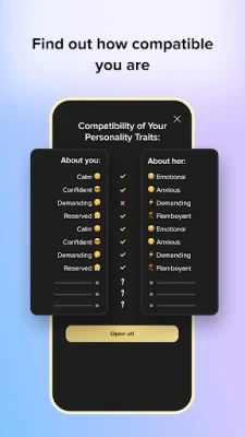 Daily view unlimited amount of profiles of real users. Upload any number of photos, see % of compatibility, how and to what extent your personality traits are compatible. Get working recommendations for dating and socializing.