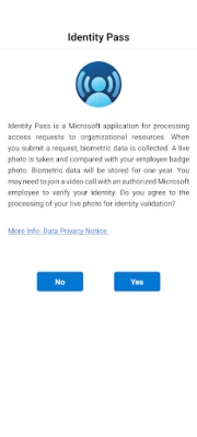 Identity Pass is a Microsoft application for processing access requests to organizational resources. When you submit a request, biometric data is collected. A live photo is taken and compared with your employee badge photo. Biometric data will be stored for one year. You may need to join a video call with an authorized Microsoft employee to verify your identity.