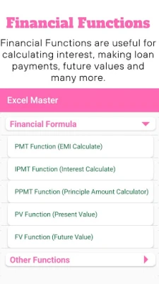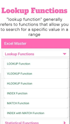 This app contains a list of tutorials & MS Excel formulas / functions including LOOKUP, VLOOKUP, HLOOKUP, INDEX, MATCH, SUM, subtract, multiply, percentage, COUNT, AVERAGE, MIN, MAX, Data Validation and many more.