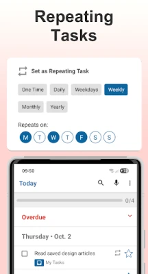 • Repeating tasks: create tasks to repeat Weekdays, Weekly, Monthly or Yearly with flexible custom options