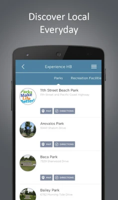 Government, Beach Information, and Experience HB sections allow you to have all the important contact and destination information in your city with the click of a button. Learn about your city's history, demographics and elected officials. Find parks, facilities and points-of-interest along with information, phone numbers, maps and directions.