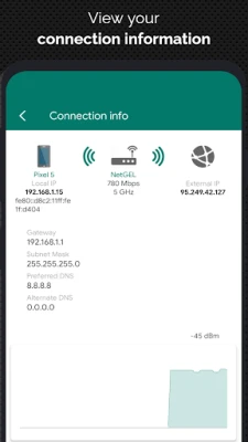 - Shows information about the wifi connection (external IP, signal strength, download and upload speed, subnet mask, gateway, DNS).