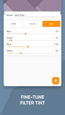 π RGB customization - Set the amount you wish of the red, green, or blue color in your filter and how much you want the screen to become dimly lit. Create your night filter.