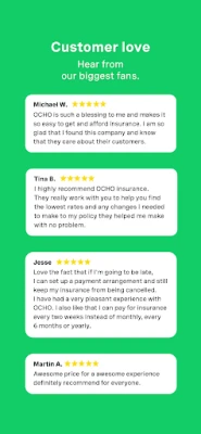 OCHO uses powerful technology to make cheap car insurance a reality. Our smart app finds you the best quotes in minutes, covers your down payment, and sets you up with a payment plan designed around your payday. Plus, you can manage everything right from your phone: no paperwork, no long phone calls, no stress. Experience the power of smarter insurance. Download the OCHO app today.