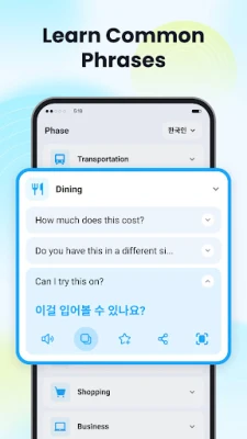 The app comes with common phrases for daily use, travel, and everyday communication. You can check sentences, pronunciation, and simple expressions to help you speak more naturally. It is a great tool for beginners or users who want quick language help.