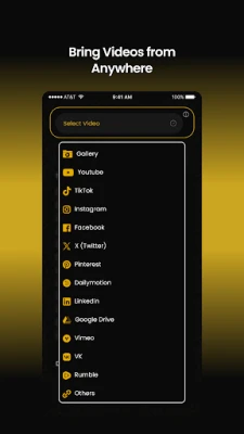 VIDEO SOURCES SUPPORTED : Device Gallery, YouTube, Facebook, Instagram, TikTok, LinkedIn, X, Dailymotion, Google Drive, Vimeo, Pinterest & public video URLs