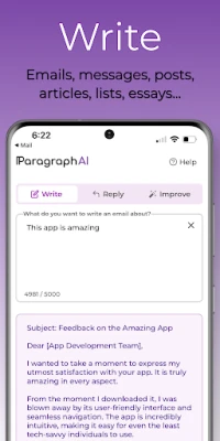 *WRITE* articles, essays, emails, messages, reports, text, and outlines on any topic. Simply describe what you'd like the AI writer to create -- "an essay outline on Macbeth", "a sales email outreach" -- and ParagraphAI will generate text in the format of your choice from a short paragraph to a detailed essay.