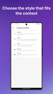 - Variety of Paraphrasing Styles: Whether you need a general, short, long, casual or even formal rewriting of your text, The Paraphrasing App can help you with all of them.