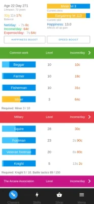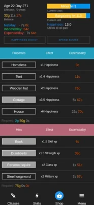 You first start off as a beggar, barely being able to feed yourself as the days go by. However, over the years you learn new skills and gain plenty of work experience to enter new high paying jobs while managing your living expenses...