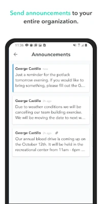 *Send out important one-way announcements to your entire organization or to select groups. Announcements show at the top of everyone’s screens until they are read, so they are impossible to miss.