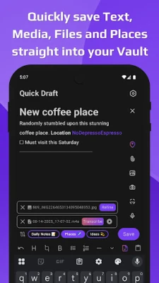 With deep Android integration and seamless Obsidian support, Quick Draft makes quick capture effortless—bridging the gap between inspiration and organized action.