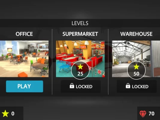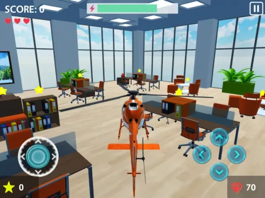 Fly remote controlled helicopters and collect stars at three different places: Office, Supermarket and Warehouse.