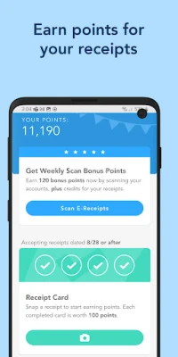 Snap a photo in the Receipts tab to submit your paper receipts. 4 valid receipts fill up one green Point Card.