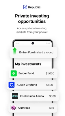 The Republic Android application (the “App”) is an extension of the Republic Site which is owned and maintained by OpenDeal Inc., which is not a registered broker-dealer, funding portal or investment advisor. OpenDeal Inc. does not give investment advice, endorsement, analysis or recommendations with respect to any securities. All securities listed here are being offered by, and all information included on this Site is the responsibility of, the applicable issuer of such securities. The intermediary facilitating the offering will be identified in such offering’s documentation. The App is subject to the same terms and privacy policy unless otherwise noted therein. The App is currently only accessible to registered users of Republic; if you wish to use Republic without registering an account please visit the Site, republic.com. The use of a promo code is subject to the promo code terms and conditions and is not guaranteed. Investments in private companies are particularly risky and may result in total loss of invested capital. Past performance of a security or a company does not guarantee future results or returns. Only investors who understand the risks of early stage investment and who meet the Republic's investment criteria may invest. No member of the Republic ecosystem verifies information provided by third-party companies on the Site and through the App and make no assurance as to the completeness or accuracy of any such information. Additional information about certain companies fundraising can be found by searching the EDGAR database, or the offering documentation provided when the offering does not require an EDGAR filing.