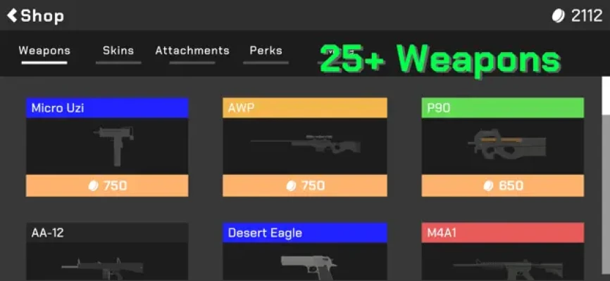Weapons range from assault rifles, shotguns, snipers, submachine guns, and pistols that fall into three modes: full auto, semi auto, and three-round bursts. Weapons also can have attachments like a red dot sight, ACOG scope, or a suppressor. Skins like desert and snow camouflage are also available.