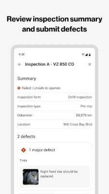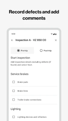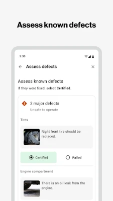 The Reveal Driver Plus app lets you: 1. Assign a vehicle to yourself. 2. Inspect vehicles using a customized form. 3. Record found defects. 4. Add details such as photos and comments. 5. View existing defects and if fixed, certify them. 6. Sign the inspection report certifying that the information is accurate.
