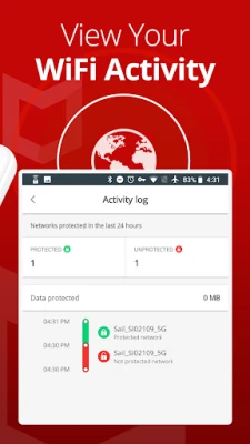 We suggest you keep Safe Connect’s free VPN service with Wi-Fi protection turned ON whenever you’re online to minimize your online security risks and keep your sensitive data safe from prying eyes and sticky fingers. Unlike your home Wi-Fi, the vast majority of public Wi-Fi hotspots aren’t password-protected and do NOT encrypt any data being transmitted, leaving all of your information vulnerable to corruption. As a direct consequence, whenever you connect to a public hotspot without VPN service, all of your online activities - from social media content to bank account information - may become vulnerable to hackers and other cyberthreats. With McAfee Safe Connect VPN, your online privacy and your Wi-Fi security are protected.