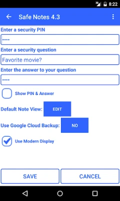Safe Notes is a notepad application that stores your notes in a secure manner using 128 bit encryption and provides quick & easy access using a simple pin number or a secret question/answer (can be used like a password instead of pin). Notes can be identified using a separate title instead of just the first line of the note. Safe Notes stores all your data on the device instead of uploading your personal information to the internet. Safe Notes is easy to use and provides a simple interface. Safe Notes is a secure and easy to use notepad application.