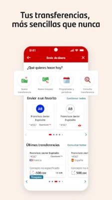 •Nueva zona de envío de dinero. Un espacio más ágil e intuitivo desde el que realizar traspasos, transferencias, pagos de nóminas o pensiones… y en el que tus contactos favoritos y los envíos realizados están más a mano.