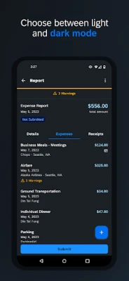• Snap a photo of your receipt and instantly add it to your expense report