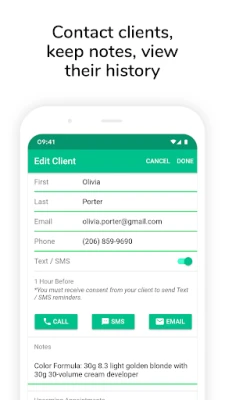 Clients receive email confirmations and appointment reminders. Free unlimited SMS/Text message appointment reminders. (Providers also receive push notification reminders prior to appointment and when appointments are booked.)