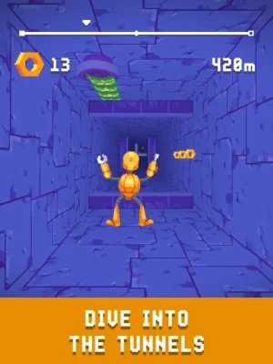 Dive into an incredibly fast-paced and beautifully crafted retro runner! Control your robot with just a finger to dodge sawblades, flames and many other dangerous obstacles while flying through an infinite tunnel. Are you ready for the drop? Parachute not included.